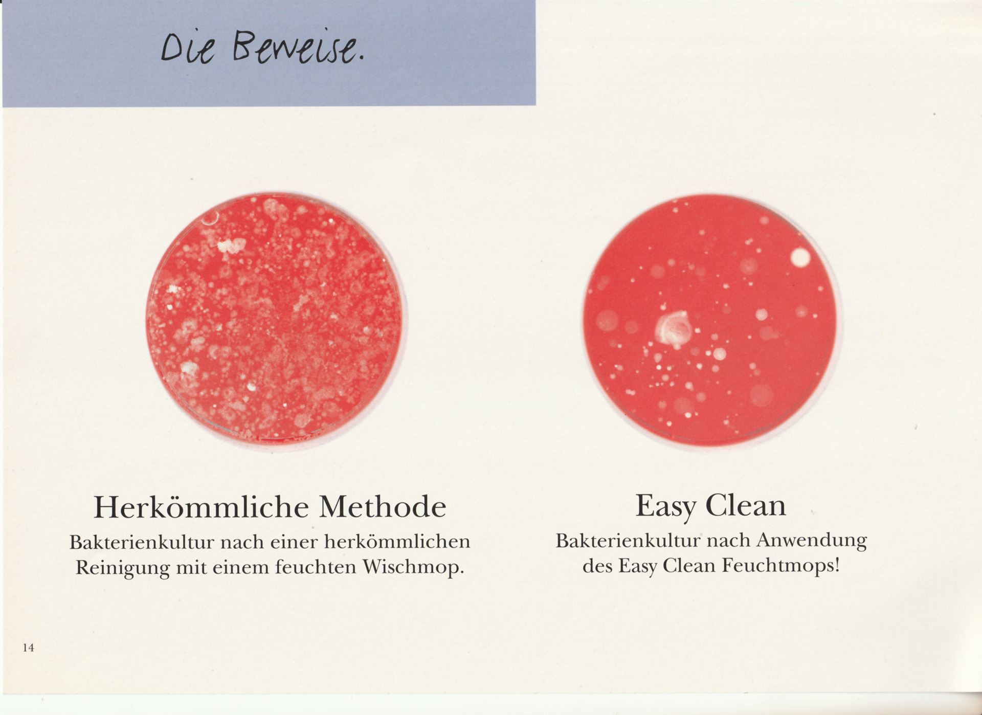Das linke Bild zeigt eine Bakterienkultur nach der herkömmlichen Reinigung mit einem feuchten Wischmopp. Das rechte Bild zeigt eine Bakterienkultur nach der Anwendung mit EasyClean Feuchtmopps!