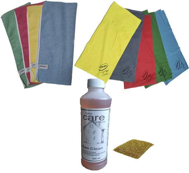 1 x SanCLEAN 500ml + je ein Multizwecktuch 32x32cm & ein Glas-& Kristalltuch 40x40cm Ihrer Wahl. Das perfekte Set für Ihr Bad.